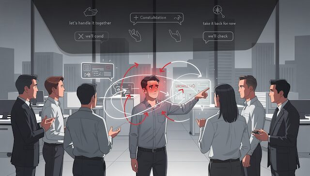現場で「みんなで協力して対応します」「内部で揉んでみます」という言葉が出たとき、それは前向きな対応ではありません。担当者が答えを持っていないまま、会議の場で初めてみんなに解決してもらおうとしているだけです。問題を抱えた本人が答えを持たないまま会議を召集し、その場にいる全員に解決を委ねる。そこに集まった人数にかかる時間を工数として意識する感覚もありません。プロジェクト全体のコストを誰も計算していない中で、責任だけが集団の中に拡散していきます。