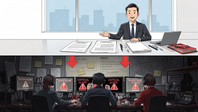 契約上の責任はない。その言葉は、現場でエンジニアを守る盾にはなりません。責任分界が曖昧なまま送り込まれた側が感じるのは、安心ではありません。目隠しをされたまま、崖の縁を一歩ずつ、つま先で歩かされているような感覚です。落ちた後に誰が手を離したのかは曖昧にされるのに、落ちた責任だけは自分に集まる。その緊張が、毎日途切れず続きます。