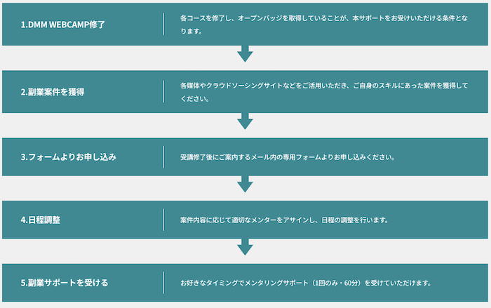 DMM WEBCAMPの受講までの流れは、学び始める前の不安を取り除き、最初の一歩を踏み出しやすくするよう設計されています。