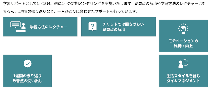 また、週2回のメンタリングでは進捗確認や課題の相談ができ、挫折を防ぎながら継続できる環境が整っています。
