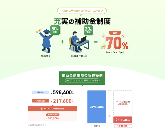 DMM WEBCAMPの料金体系は、金額の明確さだけでなく、サポートや補助金を含めた“受講しやすさ”が特徴です。