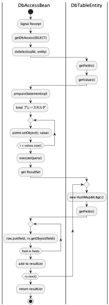 DbTableEntityを利用することで、SQLプレースホルダにバインドする値を順序付きで安全に保持できます。getFieldsとgetValuesのペアにより、SQLの構文生成とPreparedStatementへのバインドが正確に連携される設計です。この構造により、バインドミスや実行エラーのリスクが極めて小さくなります。 - doSelect / doExec の明確な責務分離
