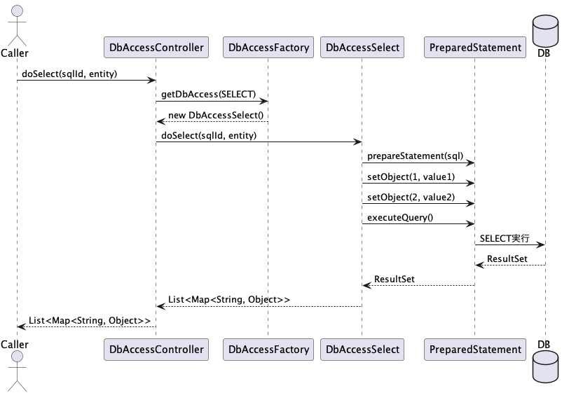 このように、実行対象のクラスはDbAccessFactoryを通じて取得され、実行種別であるDbAccessSelectType.SELECTが引数として渡されます。