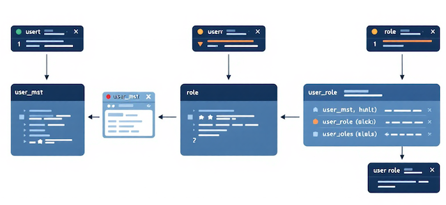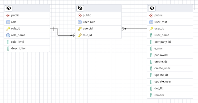 ここでは、ユーザー情報を管理する user_mst、企業情報を表す company_mst を前提に、権限を表す role とユーザーとロールを結びつける user_role の関係までを整理しておきます。