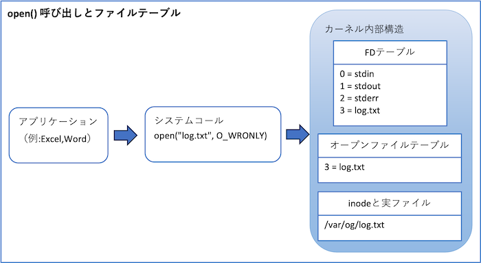 アプリケーションは open("log.txt", O_WRONLY) というシステムコールを呼び出します。この時点でアプリケーション自身はファイルの中身やinodeを直接扱っているわけではありません。システムコールを経由して、OSカーネルに「log.txtを開いて欲しい」と依頼しているのです。