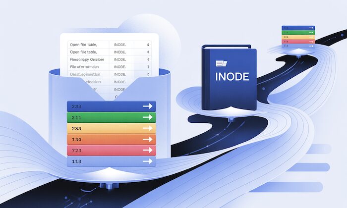 さらに奥には inode が存在します。inode にはファイルの所有者、パーミッション、サイズ、ディスク上のブロック位置など、ファイル本体に関する情報が記録されています。最終的に「FD=3 → オープンファイルテーブル #17 → inode 255 → /var/log/app.log」という流れで、アプリケーションと実ファイルが結び付けられているのです。