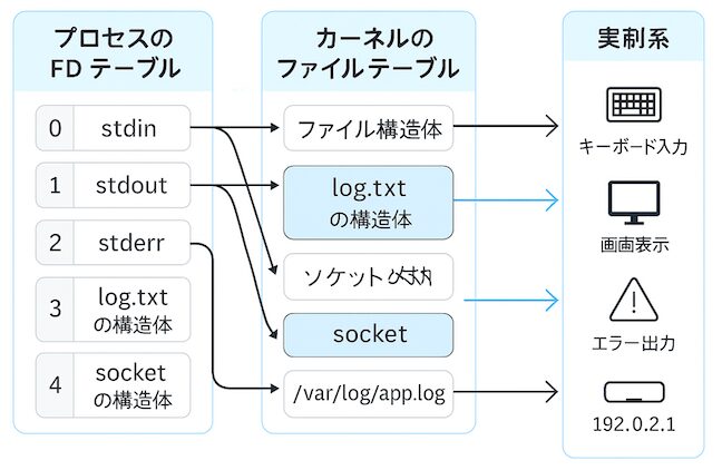 標準入力や標準出力、ソケットなども含めて、すべては「ファイルディスクリプタ」という番号で管理されます。これを理解すると、プロセスがどのリソースを利用しているかを確認でき、トラブルシュートの役に立ちます。