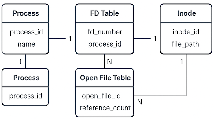 したがって最終的な流れは「FD番号 → プロセスのFDテーブル → カーネルのファイルテーブル → inode」という四段階の紐付けです。この構造があるからこそ、OSは複数のプロセスから同時にアクセスされてもリソースを正しく管理できます。