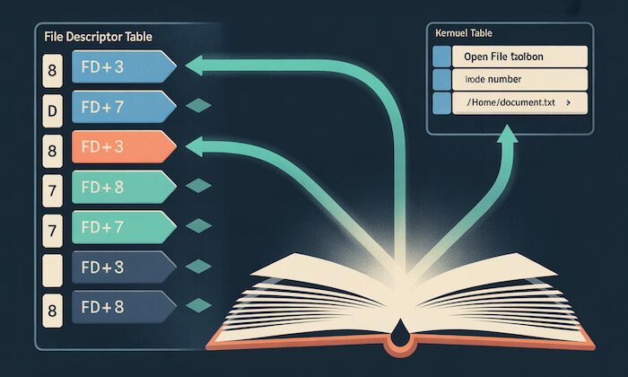 言い換えれば、ファイルディスクリプタテーブルはアプリケーション側の「しおり番号」、オープンファイルテーブルはカーネル側の「索引カード」、inode は「本の実物」という関係になっています。アプリケーションはしおり番号だけを操作しますが、カーネルが裏で索引カードを引き、最終的に本そのものへアクセスすることで、正しくファイル操作が行われる仕組みになっているのです。