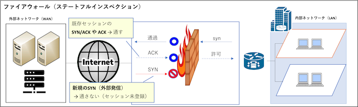 ステートフルインスペクションは通信状態を保持し、「新規」「確立済み」「関連する応答」といったセッション単位で判定します。これにより、外向きに発信した通信の戻りパケットは自動的に許可されるため、効率的で安全な運用が可能になります。