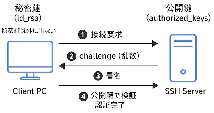 - サーバーは登録済みの公開鍵で署名を検証し、正しければ 認証完了 としてログインを許可します。
