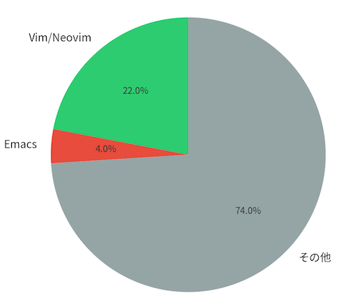 開発者調査でもVimやNeovimが20%を超えるのに対し、Emacsは3〜5%程度にとどまる傾向があります。